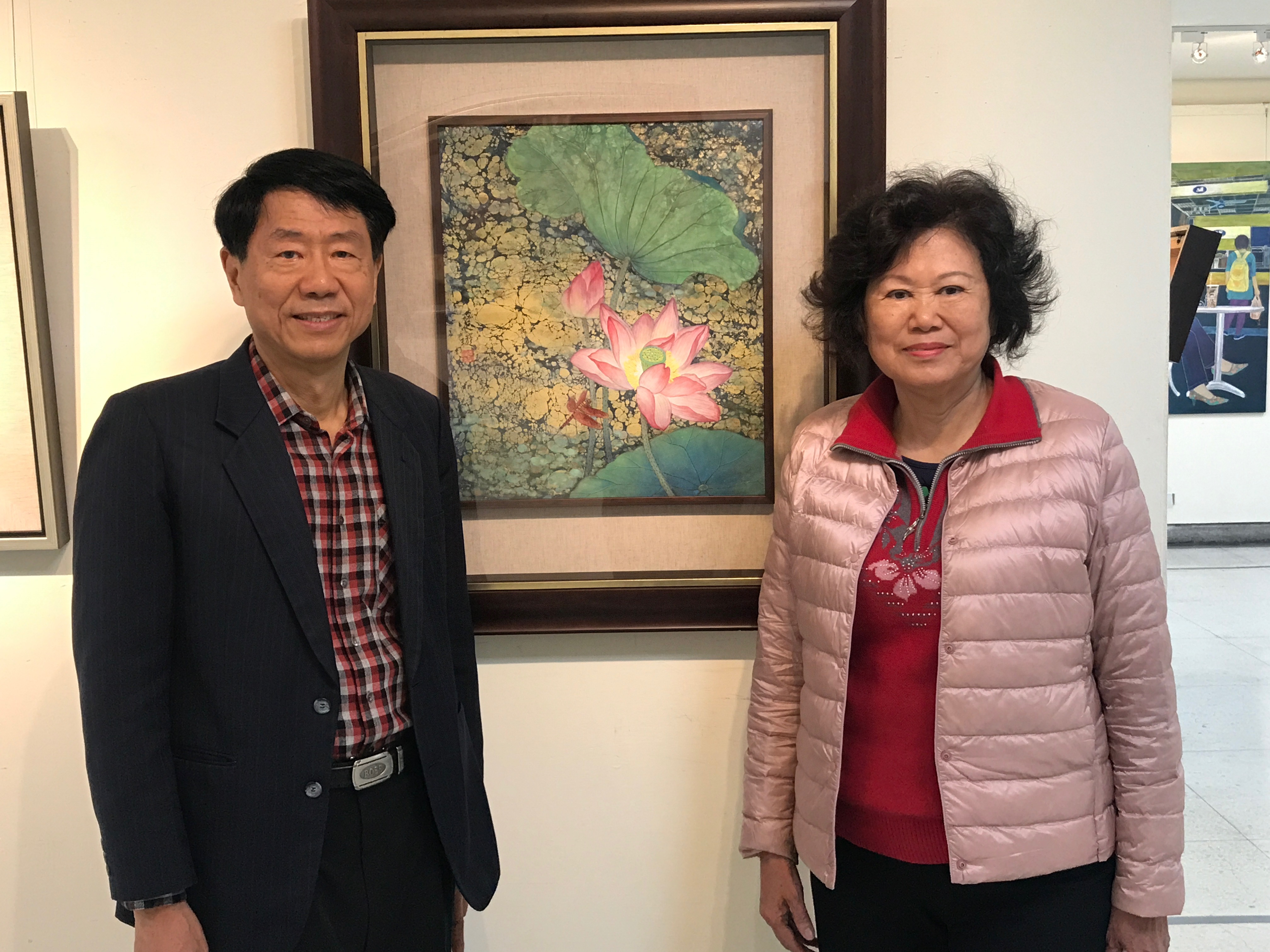 2019年元旦與三姊專業畫家參觀台中市大墩文化中心舉辦的畫展,在三姊的畫作「荷花蜻蜓」前合影。