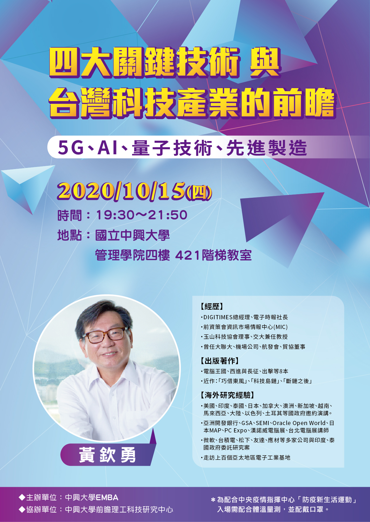 2020年10月15日周四晚上邀請好友,電子時報黃欽勇社長蒞臨EMBA課堂上發表專題演講:「四大關鍵技術與台灣科技產業的前瞻:5G、Al、量子技術、先進製造」,演講內容及現場互動非常精彩!