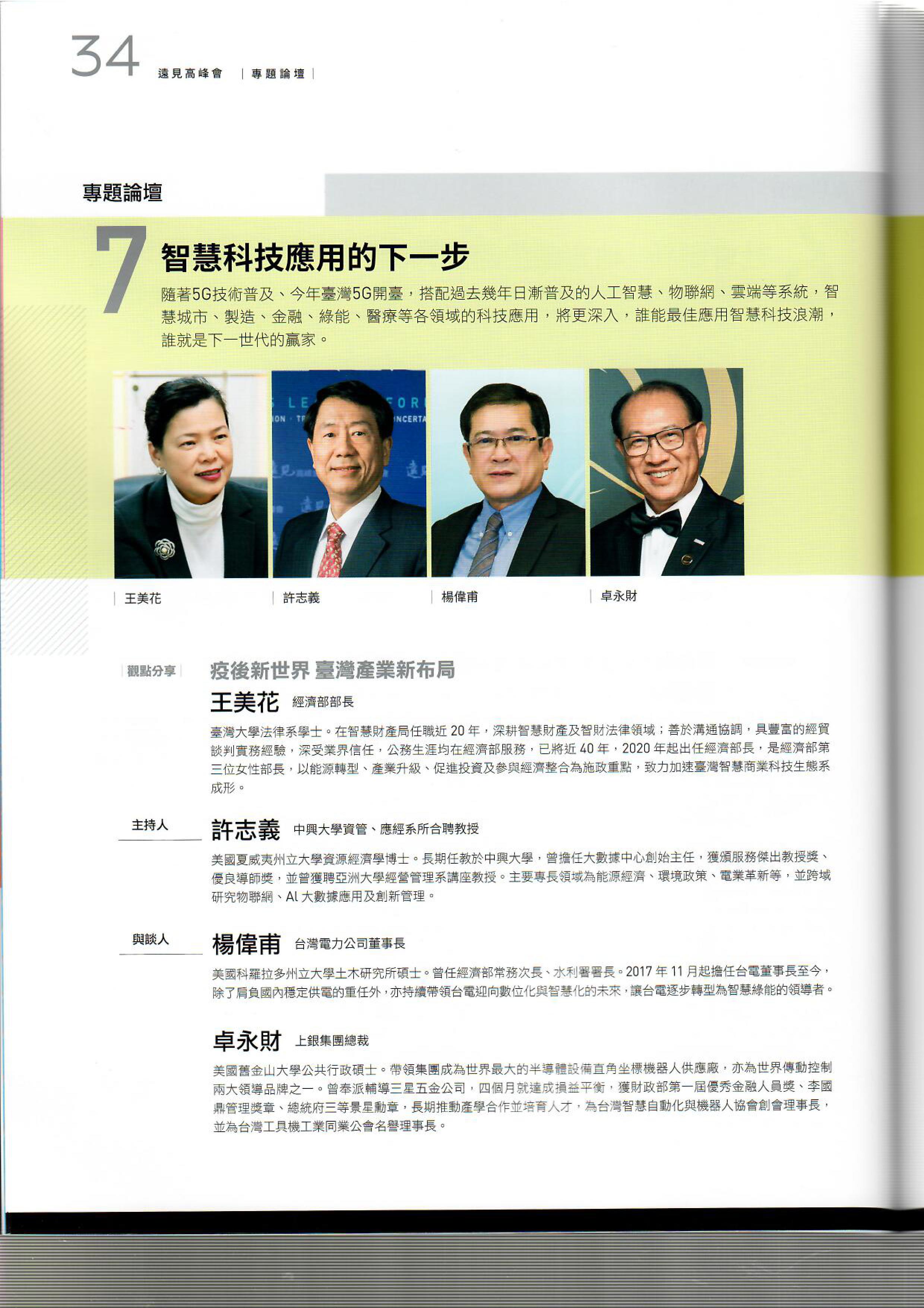 很榮幸再度應邀參加第七場論壇:「智慧科技應用的下一步」,擔任主持人。首先由經濟部王美花部長發表專題演講(陳政務次長代表),接著在我簡短引言之後,由與談者台電公司楊偉甫董事長、上銀科技集團卓永財總裁發表精闢觀點。此一論壇,相關內容之報導如下:https://www.gvm.com.tw/article/75669